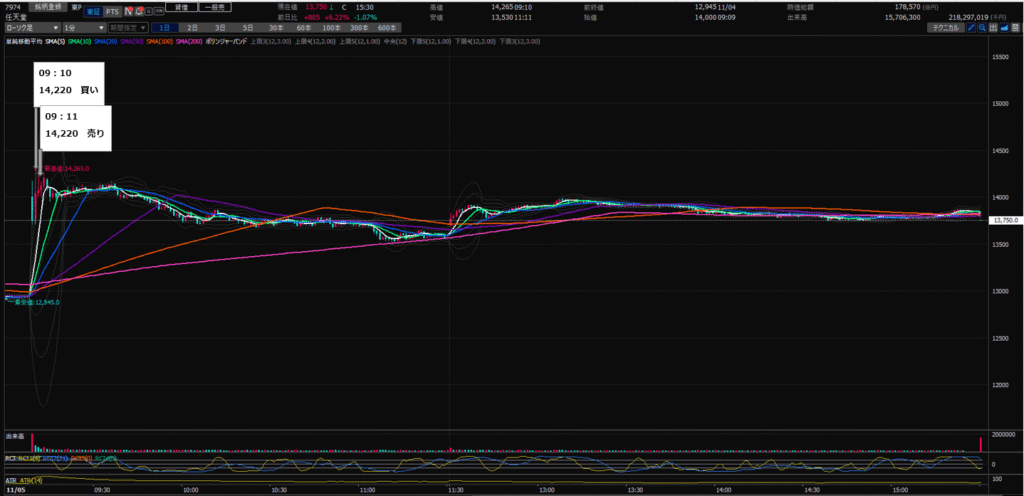 任天堂は寄り付きで上がると見て入ったが、思ったほど勢いがなく同値撤退