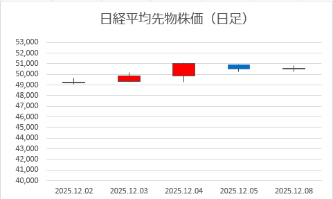 その後は 50,300円台〜50,500円台を往復するだけの展開でした。