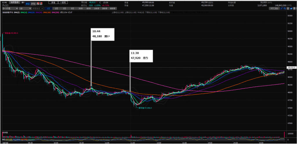 一方、ディスコは49,900円から47,550円まで2,350円下落し、そこから48,890円まで1,340円戻すなど、非常にボラティリティの高い一日でした。