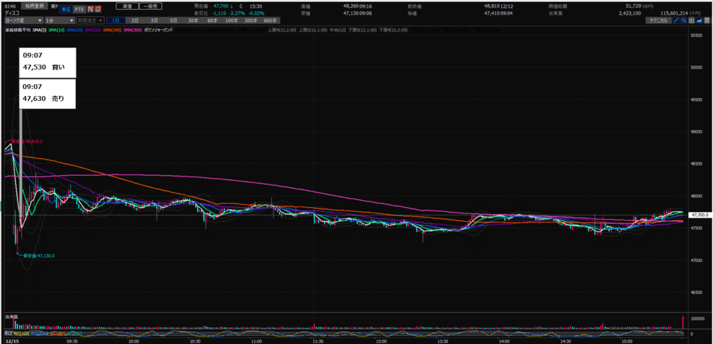 当日の動きとしては、9時06分に安値47,130円をつけ、9時16分に高値48,260円をつけました。