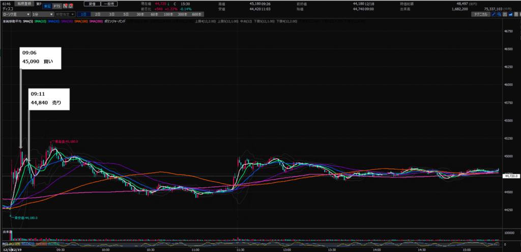 今日のディスコのデイトレードでは、株価が一気に動いた場面で飛びつく形で買ってしまい、結果的に損切りが大きくなってしまいました。