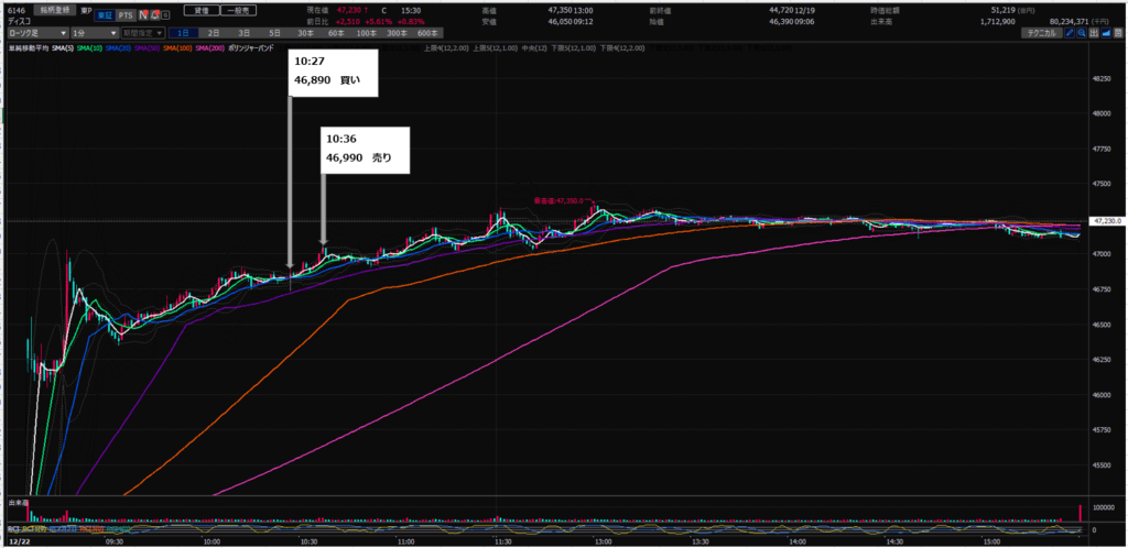 ディスコのデイトレードでは、私が買った価格まで株価が二度と下げてくることはありませんでした。そのため、もう少し持っていれば良かったと感じています。