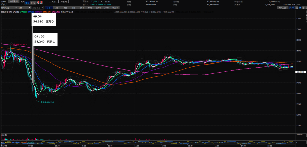 しかし、寄り付きから上昇したため「上に行くのか」と思った直後に下落し、判断が非常に難しい動きとなりました。